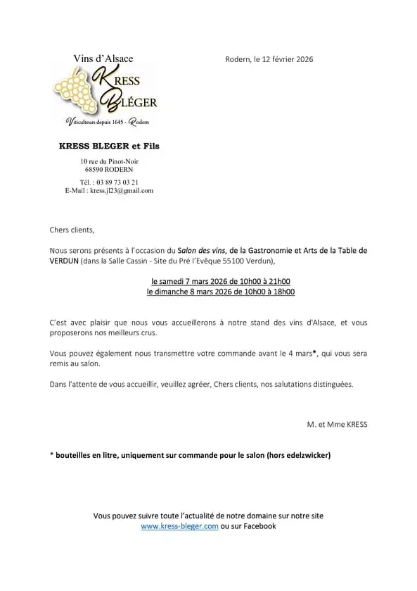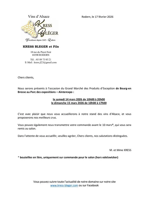 C’est avec plaisir que nous vous accueillerons à notre stand des vins d’Alsace, et vous proposerons nos meilleurs crus.