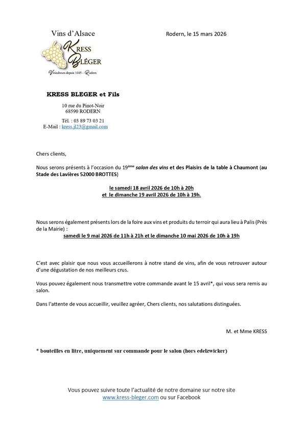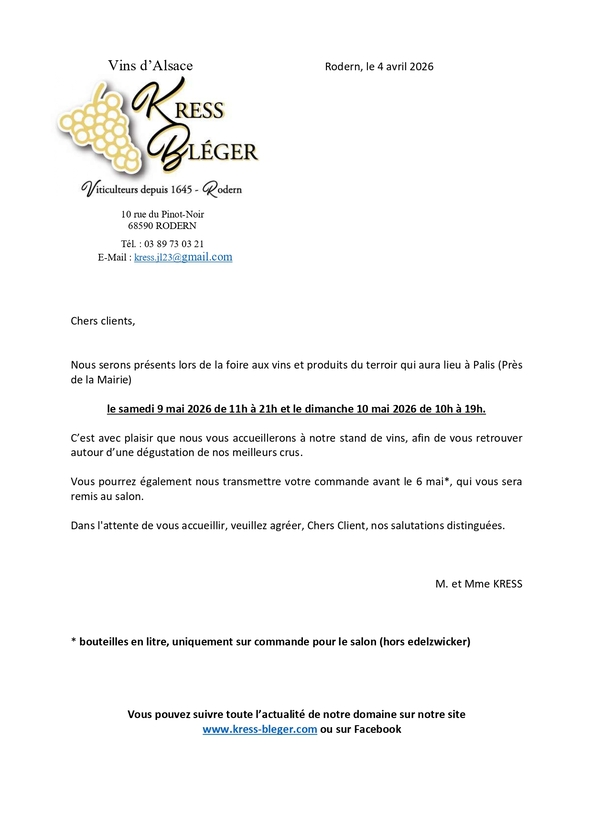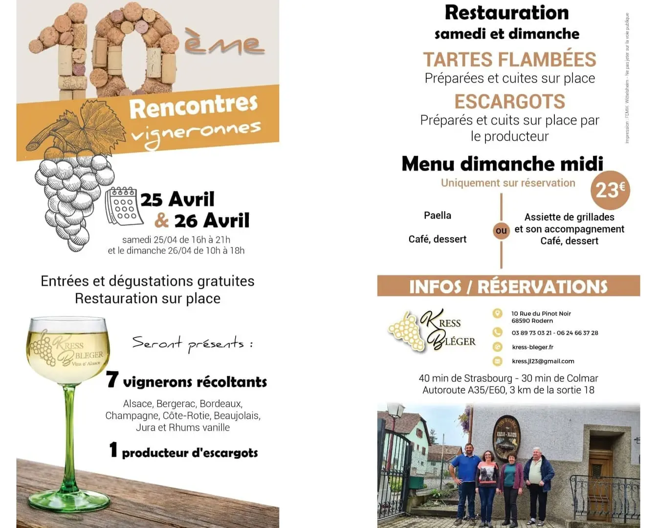 Portes ouvertes chez votre vigneron Kress-Bleger à 68 Rodern les 25 et 26 avril pour la « 10ème Rencontres Vigneronnes «